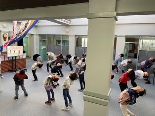 今朝は、集合写真の前にラジオ体操とダンスの練習をしました。少し寒い朝でしたが、朝から運動をして体はぽかぽかになりました。