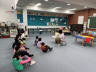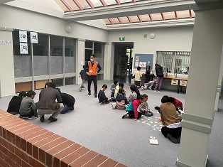 このところ、雨の日が多く外で遊べない日もあります。そんな日には、ホールに集まってゲームをしたり次の時間の準備をしたりして過ごしています。