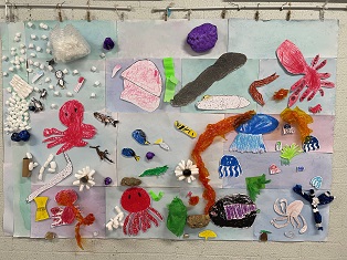 プレップからG2の子どもたちが、図工の時間に共同作品を完成させました。ホールに展示していますので、実物をご覧ください。