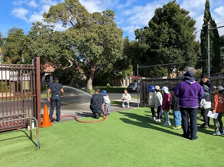 プレップからG2の子どもたちが、消防体験をしました。教室で火事についての学習をした後、外に出て放水しました。