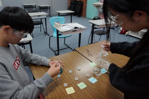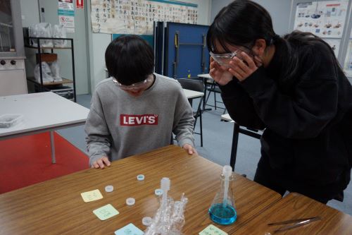 G9の理科、イオンの学習の様子です。 亜鉛・銅・マグネシウムを硫酸亜鉛水溶液と硫酸銅水溶液にそれぞれ浸した時に どんな反応が起こり、何が発生するでしょうか? 今まで学習してきた知識を活用して、考えを話し合い、予想を立てて実験をしました。