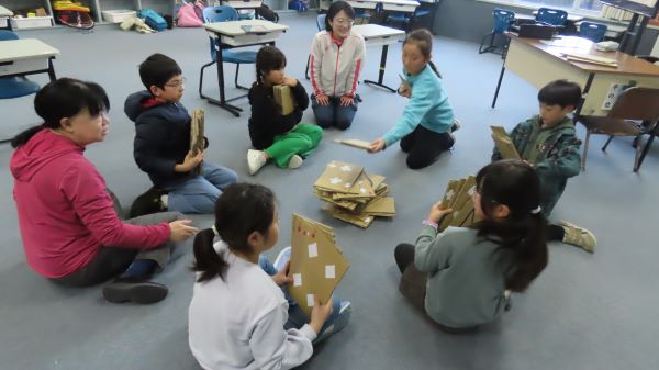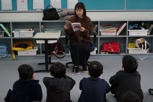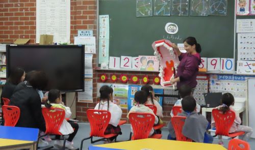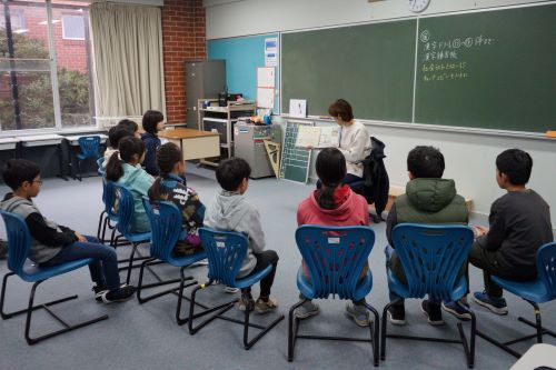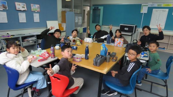 今日は小学部に保護者のボランティアの方が読み聞かせに来てくださいました。 プレップ~G2は「びゅんびゅんごまがまわったら」を読んでいただきました。 G1はお話を聞いた後に、さっそくびゅんびゅんごまを作って遊んでました。