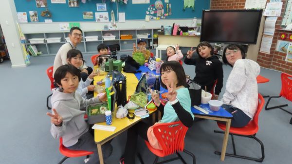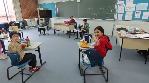 朝、縦割り活動をした日のランチタイムは、縦割り活動グループでお弁当を食べます。 (③④⑤に続きます。このメル校ニュースは一つの記事に一つの写真しか載せることができないのです。)