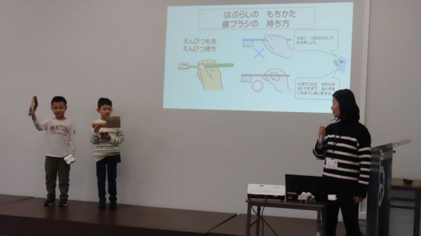 今日は虫歯予防デーにちなんで、はみがき集会が行われました。 今回の担当はG1です。 二人の漫才から始まった楽しい集会、 正しいはみがきの仕方をみんなに上手に説明することができました。