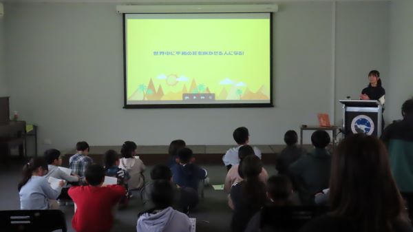 山西さんはタンザニア・マレーシア・インドで子供たちの支援をされていたり、日本の災害支援ボランティアとしても活動されています。 それらの国の支援の様子やボランティア活動の話もしてくださいました。 「世界中に平和の花を咲かせる人になる!」という強い意志のもと、活動されている姿に触れ、その行動力と発信力は本当にすばらしいと感じましたし、 これから山西さんがどんな風にその活動を広げ、さらに活躍されるのだろうと、とても楽しみになりました。 メル校の子供たちもメモを取りながら、山西さんの顔を見て、真剣に話を聞いていました。 子供たちと歳も近い山西さんがこのような活動をされていることに触れ、きっと心に感じるものがたくさんあったと思います。 最後に「『家族がいつでもどこからでも青い空を見られる世界』を願っています」と締めくくられました。 この言葉を聞いて、私がまだ小学生の頃、空を見上げて「飛行機が飛んでる、きれいな空だね。」と言った時に、 戦時中に子供時代を過ごした親が、 「空を見上げて『もう爆弾は空から落ちてこないんだ』と思った時に、戦争が本当に終わったんだなあと思ったよ。今は幸せな時代でよかったね。」 と言ったのを、ふと思い出しました。 青い空をなんの心配もなく「きれいな青空だなあ」と見上げることのできる平和な世界を大事にしたいです。 保護者の皆様もたくさん参加してくださいまして、ありがとうございました。 今日の山西さんのお話をきっかけにして、ぜひお家でお子さんと平和について話をしてみてくださいね。