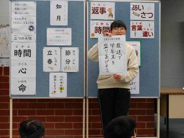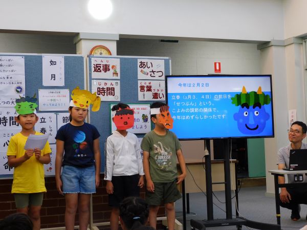 2月の小学部集会はG3の担当です。今回は節分にちなんで「豆まき集会」で、かわいい&かっこいいG3鬼が登場し、絵本で節分の由来を読み聞かせてくれたり、鬼の嫌いなものなどの豆知識を教えてくれたりしました。みんなで一斉に「へえ~~~!」と言った豆知識は、メル校にいる先生の中で二人だけ豆まきをする必要がない先生がいるということでした。さてなんという名字の先生でしょう?平安時代に鬼退治をしたあの人です。答えはG3まで!