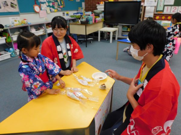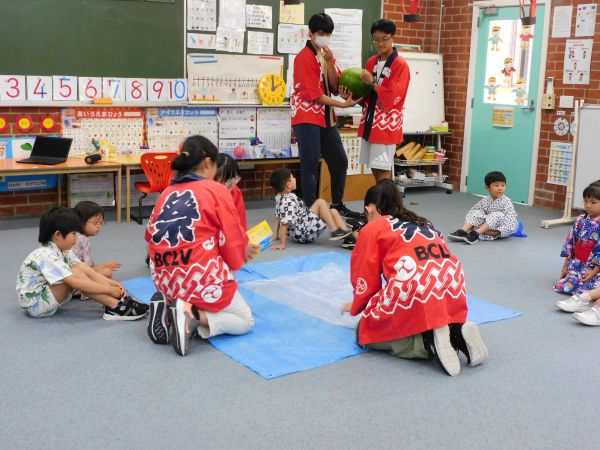 中学部のお兄さん・お姉さんが職場体験で来てくれるのに合わせて、プレップで夏祭りごっこをしました。プレップのみんなで準備してきた「金魚すくい屋さん」「かき氷屋さん」「たこ焼き屋さん」などの屋台を出したり、ヨーヨー釣りをしたりしました。それから盆踊りを踊り、最後はスイカ割りで盛り上がりました。スイカ割りは全員が挑戦し、「もうちょっとみぎ~!」「まえ!まえ!」「そこ~!」などとみんなで口々に応援して、最後は中学部のお兄さんが割ってくれました。プレップにとっても中学部にとっても、とても楽しい時間を過ごすことができました。