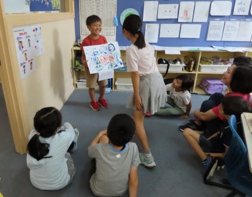 G1・2の図工は材料をじっくり眺めながら、ひらめいたものを形にしていく授業でした。みんな材料を眺めながら「あ!ひらめいた!!」と、材料がいろいろなものに変身させていました。最後は自分の作品を友友だちに見せて、「工夫したところ」と「ひらめいたところ」を発表していました。一枚の色紙やキャップやボトルが、ひらめき一つで見え方が変わるところがおもしろく、夢中になって作品つくりをして自分の世界を広げていく造形活動でした。