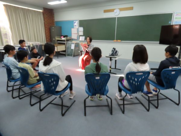 G3G4は落語「てんしき(転失気)」を読んでいただきました。体の調子を崩した和尚さん、かかりつけのお医者さんに「てんしきはありますか?」と聞かれ、わからないとは言えず「ありません」と答えました。答えたものの「てんしき」の意味が気になります。自分は聞けないので、小僧さんをうまく使ってどの意味を探ろうとしますが・・・さてさて「てんしき」とは?表情豊かに読み聞かせをしていただいたので、お話が進むにつれて、子供たちからは笑いが起こりました。オチの和尚さんとお医者さんとのちぐはぐなやりとりがおもしろくて、あっという間に時間が経ちました。
