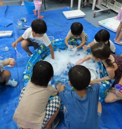 2月のメル校幼児教室は暑い夏にぴったりの「泡ぶくぶく」でした。本当なら広い運動場で思う存分遊ぶ予定でしたが、今日は午後から高温になりすぎて屋外活動ができず、プレップ教室で行うことになりました。石鹸水を泡だて器やスポンジで泡立てて、思い思いの色をつけて、カップに入れて、ジュースやケーキを作りました。暑かったので、冷たい水で遊ぶのはとても気持ちよかったようで、みんな夢中になって遊んでいました。次回は3月5日「足で遊ぼう」です。次回もたくさんのお友達のご参加をお待ちしています。