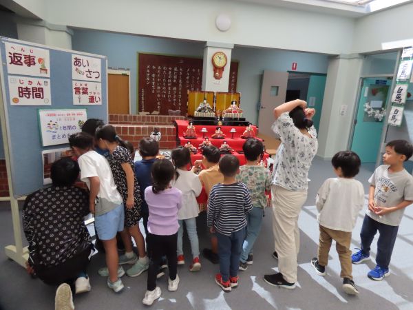 メル校には立派なおひなさまの段飾りがあります。今日はプレップさんが3月3日のひな祭りに向けて、1階ホールで飾り付けをしてくれました、写真を見ながら、「このお人形はどの場所だろう?」「この扇子はだれがもっているのかな?」などと言っていると、正義の味方G2レンジャーが登場して、お内裏様とおひな様、五人囃子や三人官女をプレップのお手伝いをしながら、一緒に飾ってくれました。一階ホールが一気に華やかで雅な感じになりました。まるで日本にいるようです。