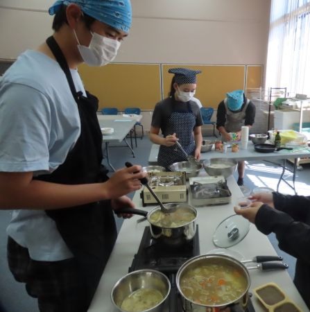 中学部の家庭科の授業で本年度最後の調理実習をしました。メニューはカレーライス・野菜のソテー・白玉フルーツポンチです。作業が進むにつれて、学校中にいいにおいが漂い、「給食の懐かしいにおいがする~!」と言って廊下を通る小学部の子がいました。みんなで協力してとても上手にできあがりました。さすが中学部です!お世話になった先生方にも持っていき、みんなでおいしくいただきました。ごちそうさまでした。ぜひお家でも家族に感謝の気持ちを込めて作ってあげてくださいね。