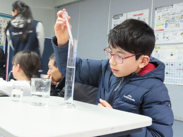 G5は今、理科で「ものの溶け方」を学習しています。今日は溶けたものの行方について予測した後、メスシリンダーで正確に水を測りとる学習をしていました。50㏄の水を正確に測るには、まず50㏄より少し少なめの水をメスシリンダーに入れます。そしてその後はスポイトで1滴ずつ注ぎながらメモリと水面がピタッとあうところまで調節して入れていきます。みんな真剣そのものです。一人一つずつ実験器具を使って実験できるのが少人数のよいところです。最後は職業体験に来てくれている高校生先生に厳しい目でチェックしてもらって・・・合格!いよいよ次の時間は溶けたものはどうなったのかを実験します。