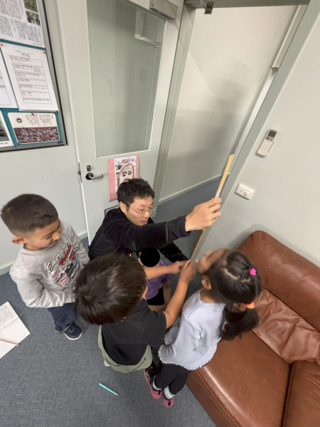 「校長先生、算数で長さをはかる勉強をしているので校長室の物をはからせてもらえませんか?」とG2がやって来ました。手には1本ずつ30cm定規とノートと鉛筆を持っています。「どうぞ!」と言って見守っていると、いろいろな物を定規の端を合わせて上手にはかり始めました。楽しそうです。校長室には大きな物もたくさんあるので、30cmより長いものをどうやってはかろうかと相談していました。その結果、みんなの定規を合わせていこうということに。先生の分も合わせて5本あるので何cmまではかれるかなと、メモリを数えて150cmだとわかりました。まさに体験して学ぶ授業です。次は理科室に行くそうですよ。