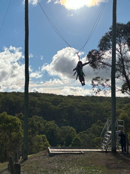 宿泊学習2日目の午後はみんなが楽しみにしていたGiant Swingの挑戦です。ハーネスをしっかりつけて、自分の行きたい高さまで仲間にロープを引っ張ってもらい、そこからロープをはずしてSwingが始まります。初めは「こわい」と言っていた子も、挑戦してみたら「楽しかった~!」「またやりたい!」と口々に言っていました。大自然の中で鳥になった気分を味わえるのは1日目のZip Line同様ですが、さらに高いところまで飛んでいけるのがこのGiant Swingの魅力ですね。斜面にいるカンガルーたちもみんな応援してくれていました。