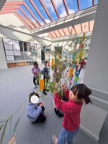 メル校は日本の季節ごとの行事を大切にしています。もうすぐ7月なので、外で育てていた笹の鉢が1階ホールに登場しました。プレップ・G1・G2が中心になって短冊を全校生に配って願い事を書いて笹につけてもらい、今日はプレップさんが手作りのきれいな「七夕かざり」を飾り付けてくれました。子供たちが書いた願い事を読んでみると、「宇宙飛行士になりたい」「お母さんになりたい」「英語が上手になりますように」「家族が元気でいますように」などなど、それぞれの温かい気持ちが伝わってきます。保護者の皆様、笹飾りのそばにプレップ特製の短冊を置いていますので、ご来校の折にぜひ願い事を書いてぶら下げていただければと思います。お家の方が書かれたのを見たら、きっと子供たちも喜ぶことでしょう。ご協力をお願いします。
