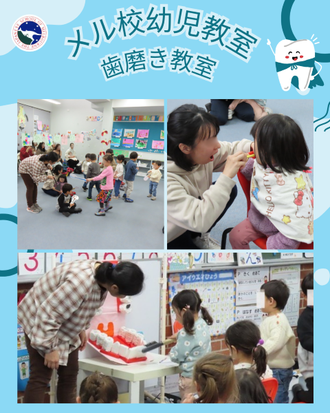 6月のメル校幼児教室は「歯磨き教室」をしました。今回は18名のお子さんたちが参加してくれました。大きなお口が登場して、乳歯の数を数えたり、6歳臼歯のお話を聞きました。その後は、みんなで歌に合わせて歯磨きの練習をしました。「おうちでも歯磨き頑張れるかな?」という質問に、みんな「はい!」と元気よく答えてくれました。次回は7月9日(水)「七夕」です。ぜひ遊びに来てくださいね!