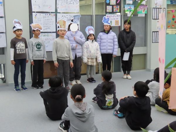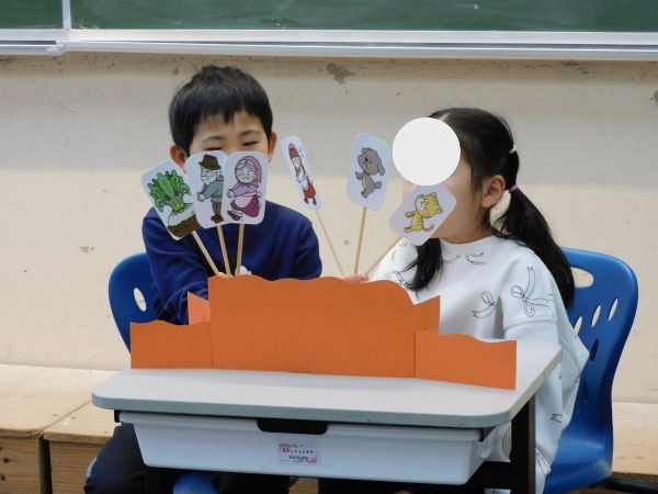プレップとG2を招待して、G1がペープサートを使って「おおきなかぶ」の音読劇をしました。国語の学習の総まとめです。「かぶをおじいさんがひっぱって、おじいさんをおばあさんがひっぱって」「うんとこしょ、どっこいしょ、とうとうかぶはぬけました」・・・文章を正しく覚えて、二人で声を合わせ、気持ちをこめて表現することができました。聞いていたみんなから「すごかったよ!」「声の大きさを変えていて上手だったよ」などの感想と大きな拍手をもらい、とても誇らしげな様子のG1の二人でした。