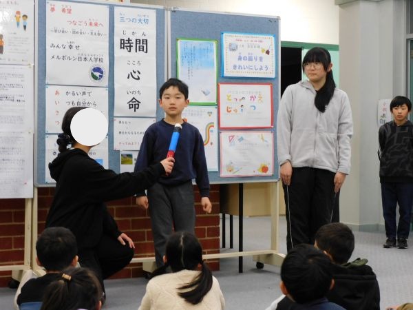 JSM集会後半は、さよならインタビューの時間でした。日本人学校にとってこれは宿命でもあるのですが、やはり今まで一緒に過ごしてきたお友だちとのお別れは本当に寂しいです。でも心はつながっていますね。日本に帰国されても、メル校のことを忘れず、次の学校でもここで培った力を存分に発揮して、力いっぱい頑張ってくださいね。みんなで応援しています。