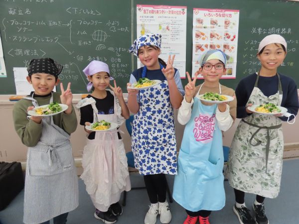 G5・6が家庭科で調理実習をしました。今日は「炒める」が課題です。メニューは「ブロッコリーとハムと玉ねぎのソテー」と「スクランブルエッグ」の2種類です。G5・6のみんなで材料を慎重に切り、卵を上手にかき混ぜて、いよいよフライパンを熱して材料を入れました。火の加減も上手にでき、炒め方もバッチリです!見た目も華やかな美味しいソテーとスクランブルエッグが出来上がりました。お味ももちろんYummy! Delicious!! 調理も後片付けも手際の良さにびっくりしました。きっとお家でもよくお手伝いをしているのだろうなあと感心しました。ぜひお家でも作って家族に食べさせてあげてくださいね。