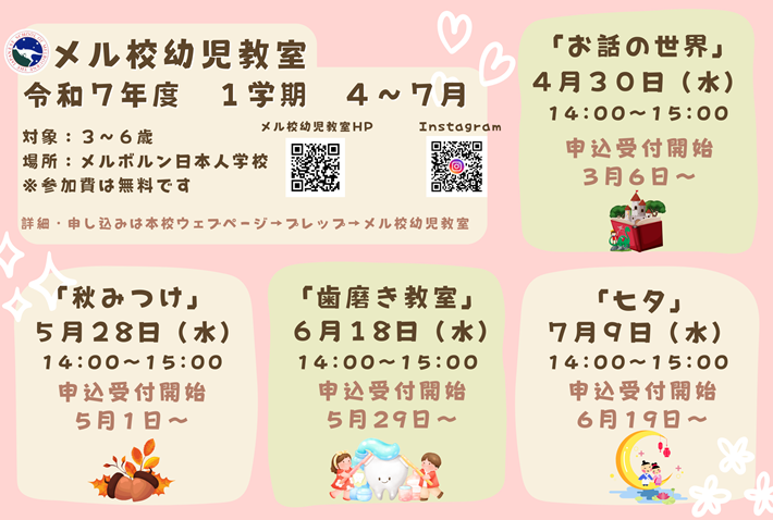 毎月1回メル校幼児教室を開いており、毎回ご好評いただいています。プレップに入学する前のお子さんたちと、日本の季節や行事、ごっこ遊び、運動遊びなどをして楽しんでいます。本校プレップの先生と子供たちが毎回わいわい賑やかに行っています。